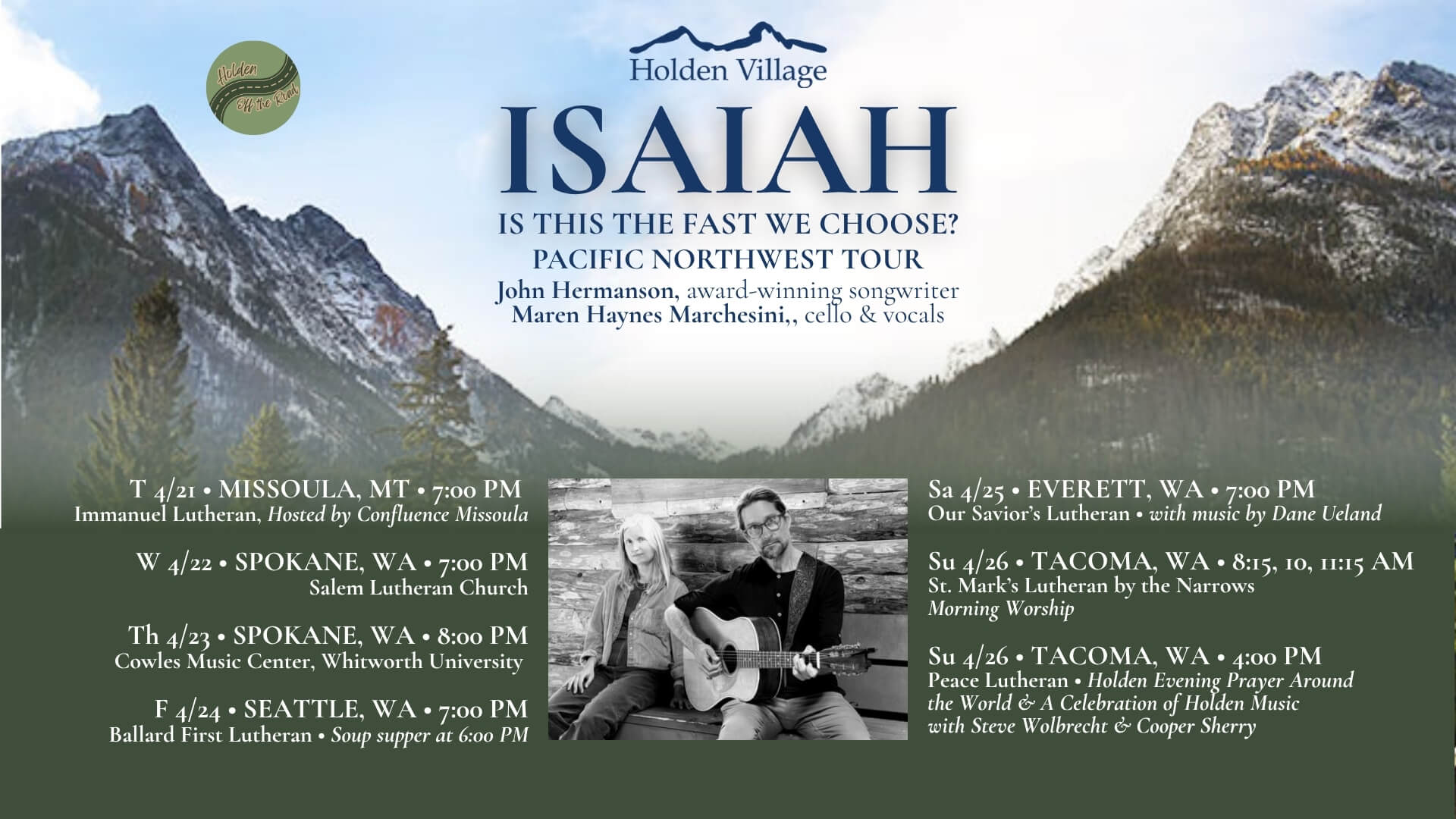 Join award-winning songwriter John Hermanson and editor/arranger, cellist, and vocalist Maren Haynes Marchesini for a Pacific Northwest Tour of “Isaiah Vespers: is this the fast we choose”